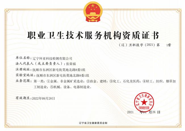 遼寧環(huán)亞科技檢測有限公司秉承“公平、公正、客觀、真實”的服務(wù)理念,力求為遼寧省各企事業(yè)等用人單位提供更優(yōu)質(zhì)的服務(wù),公司領(lǐng)導率領(lǐng)全體員工歷時一年零八個月的時間操練各項基本技能,于2016年8月9日取得了(遼)安職技字(2016)第B-0019號《職業(yè)衛(wèi)生技術(shù)服務(wù)機構(gòu)資質(zhì)證書》